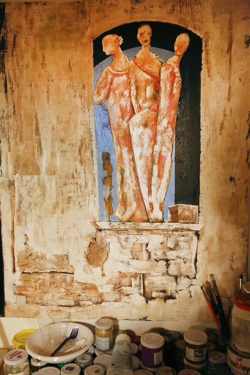Kristina, impegnata come lui nell'organizzazione dell'evento, ha potuto produrre solo due tele, ma riversandovi, come una pioggia irrefrenabile, ricordi che scavano le immagini caricandole di pathos.